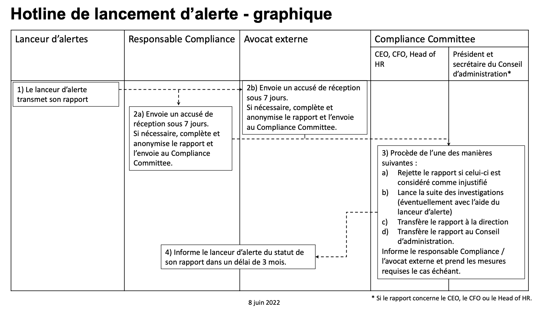 En plus du responsable Compliance STARRAG (en la personne du CFO du groupe STARRAG), un cabinet d’avocats externe (Silk Rechtsanwälte, Zurich en Suisse) est également mandaté comme médiateur neutre. En utilisant l’adresse e-mail plus bas, un lanceur d’alerte peut directement contacter le responsable Compliance ou un avocat de confiance externe et alerter de la constatation d’éventuelles infractions graves aux règles. En plus du contrôle de la plausibilité et de la pertinence des alertes, le responsable Compliance/l’avocat de confiance accompagne aussi le lanceur d’alerte pour le conseiller sur le système d’alerte s’il le souhaite. Puis, il fait parvenir toutes les informations, dans l’étendue discutée avec le lanceur d’alerte, pour traitement par le Compliance Committee STARRAG. Le Compliance Committee se compose du CEO, du CFO et du Head of HR de STARRAG. Sauf si l’une de ces personnes est concernée par l’alerte. Dans ce cas, le Compliance Committee sera composé du président et du secrétaire du conseil d'administration de STARRAG.